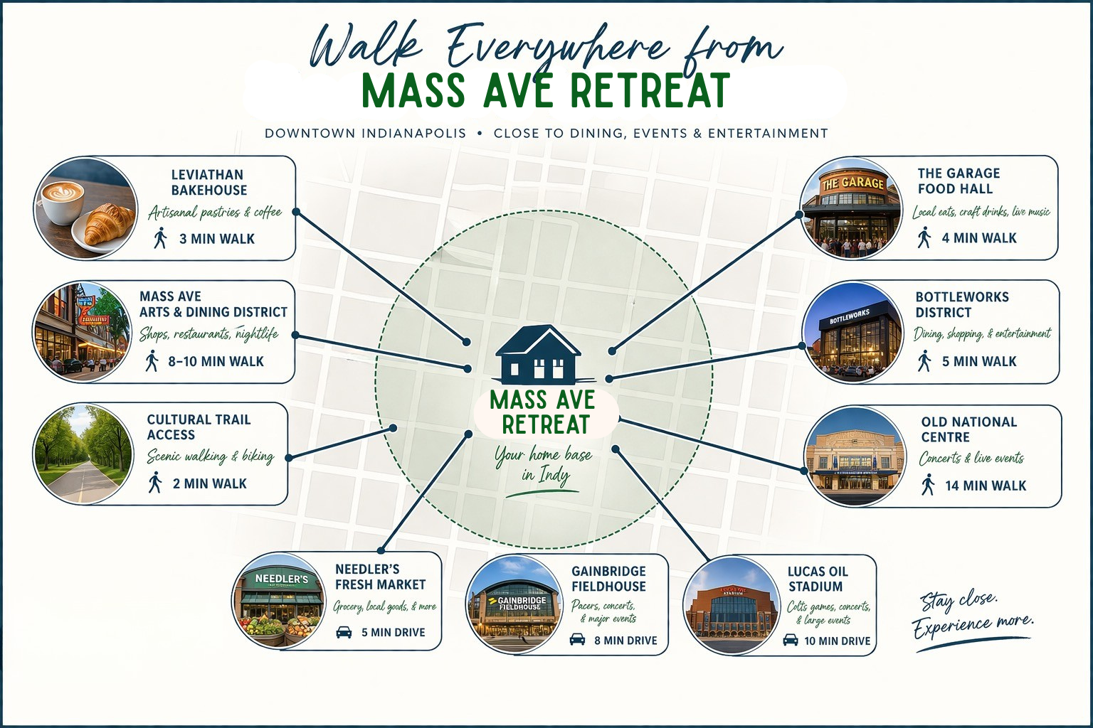 The Mass Ave Hideaway is nestled in the historic Mass Ave / Chatham Arch neighborhood. You're just steps away from all the area and Downtown Indy has to offer and can also enjoy a quieter side-street just a block or two from the sought-after Mass Ave corridor.
